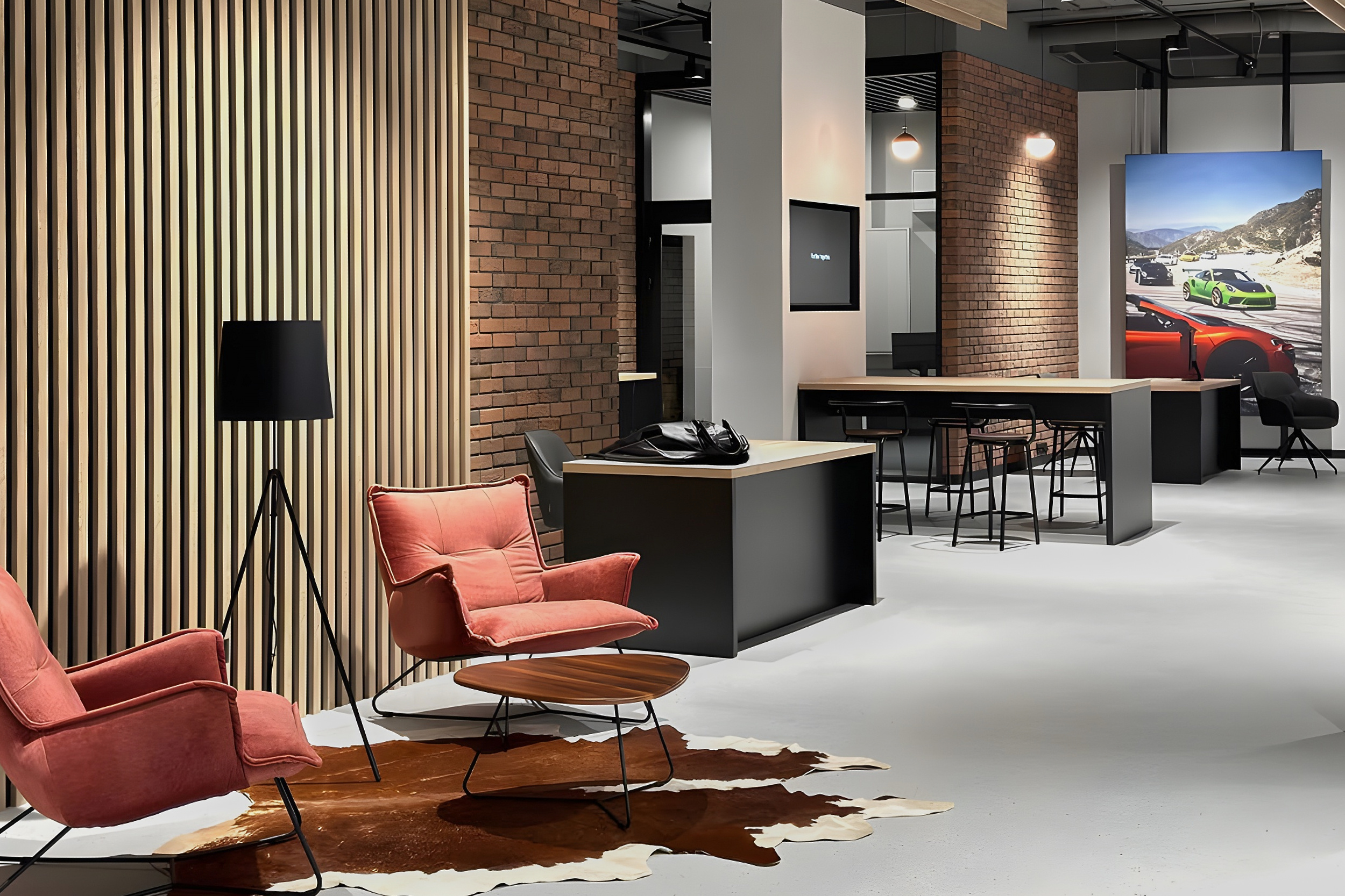 Что касается отделочных материалов, мы попытались переосмыслить холодные и безликие автосалоны и сделали пространство более уютным и домашним. Тем более что это сейчас современный тренд в дизайне автосалонов. Использовали кирпич на стенах, дерево в мебели и отделке, бетон на полу. Но дизайн автосалона не превратился в лофт — стиль остался современным.