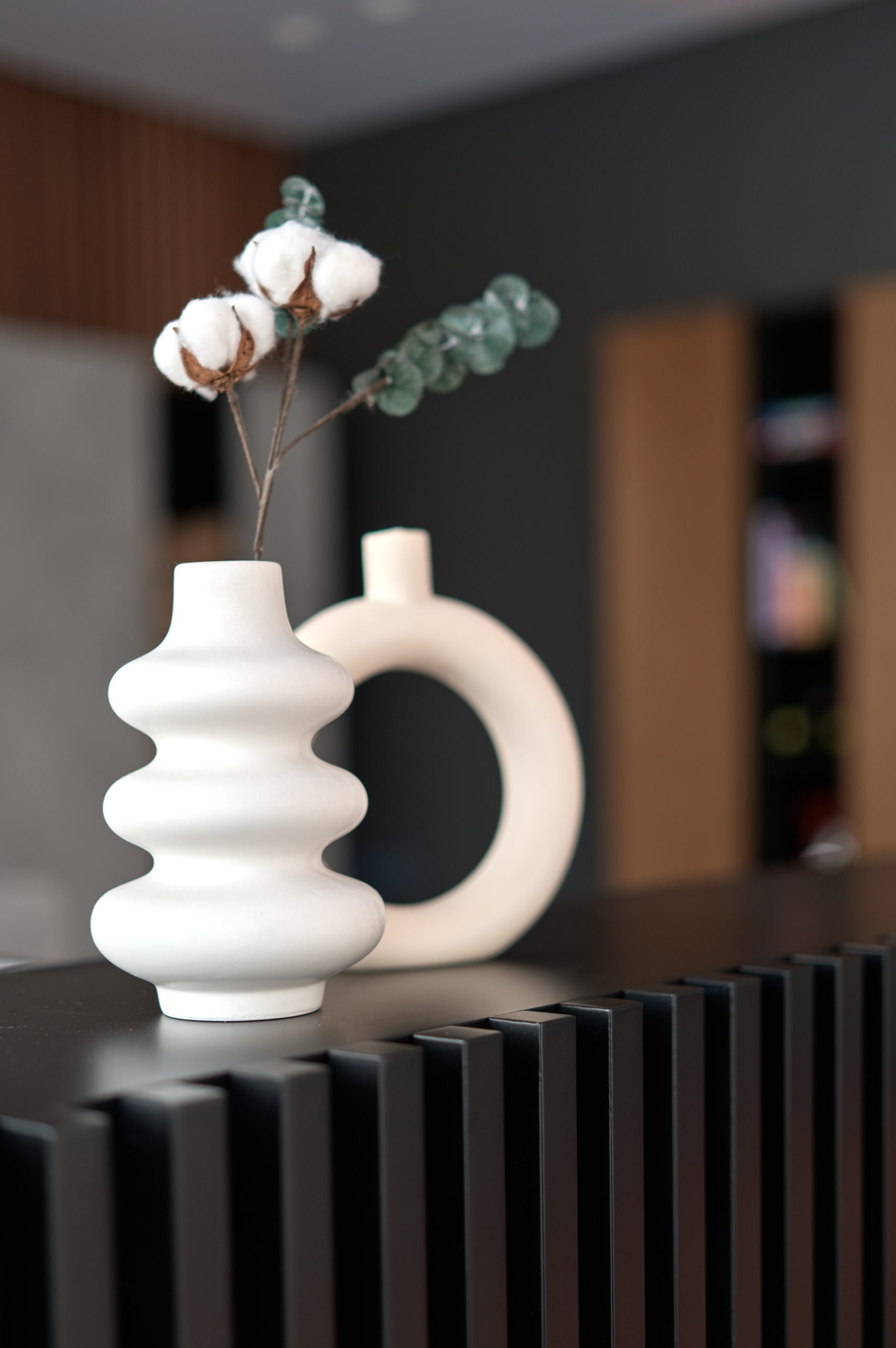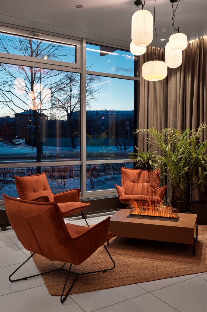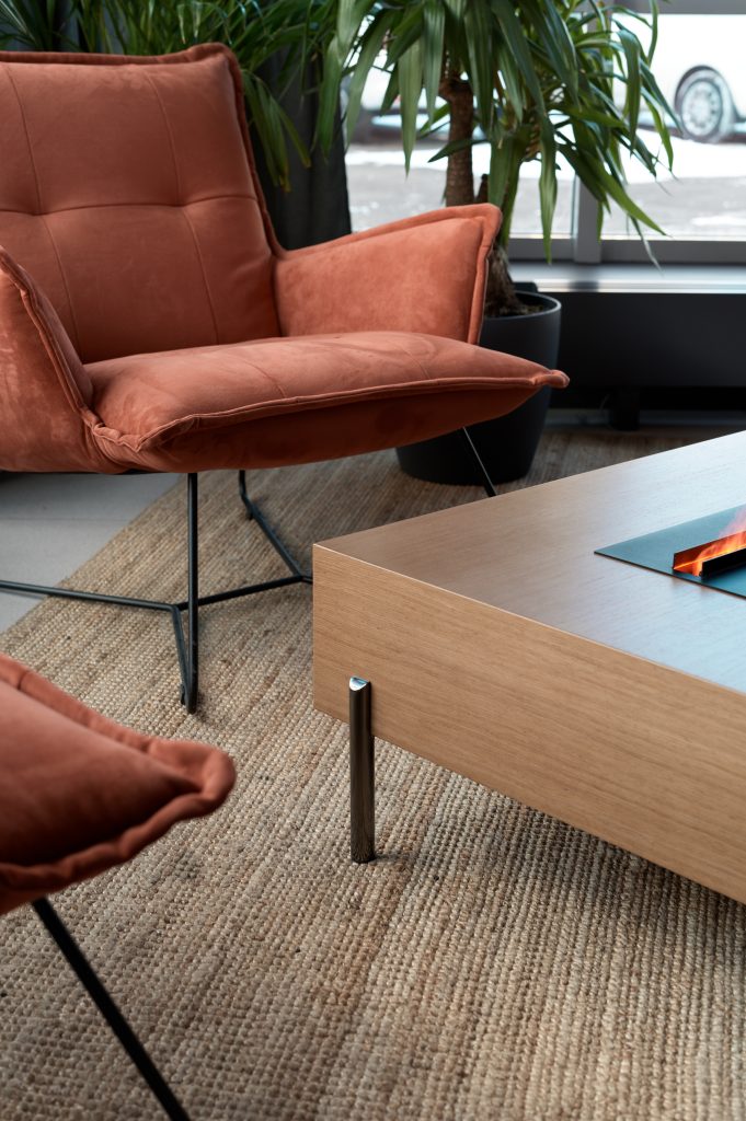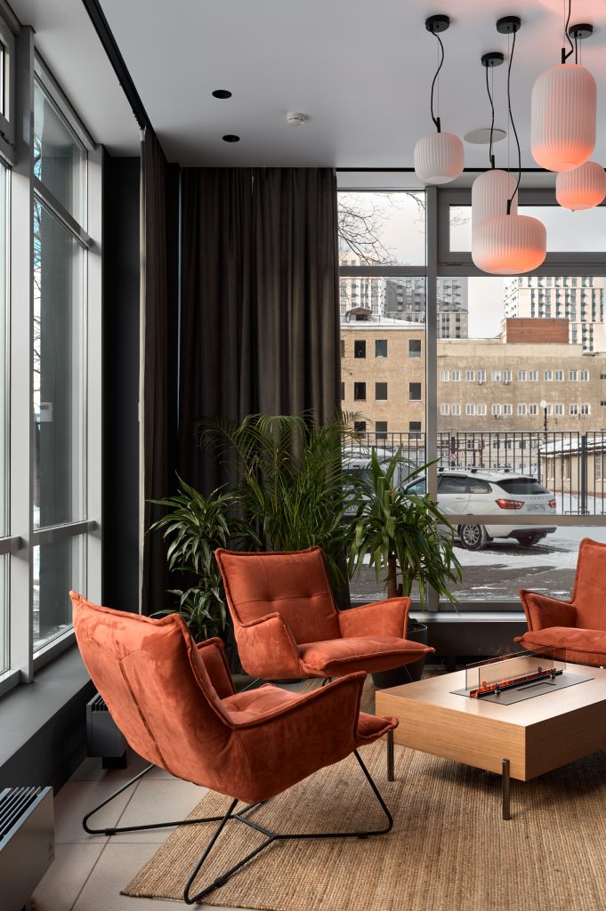 Камин — это ритуал. Присесть, откинуться в кресле, завести разговор, пока огонь играет перед глазами. Центром пространства мы сделали именно такое место: поставили кресла в терракотовой обивке, добавили натуральное дерево и немного полированного металла. Получилось место, где хочется задержаться — выпить кофе, обсудить проект или просто посидеть.