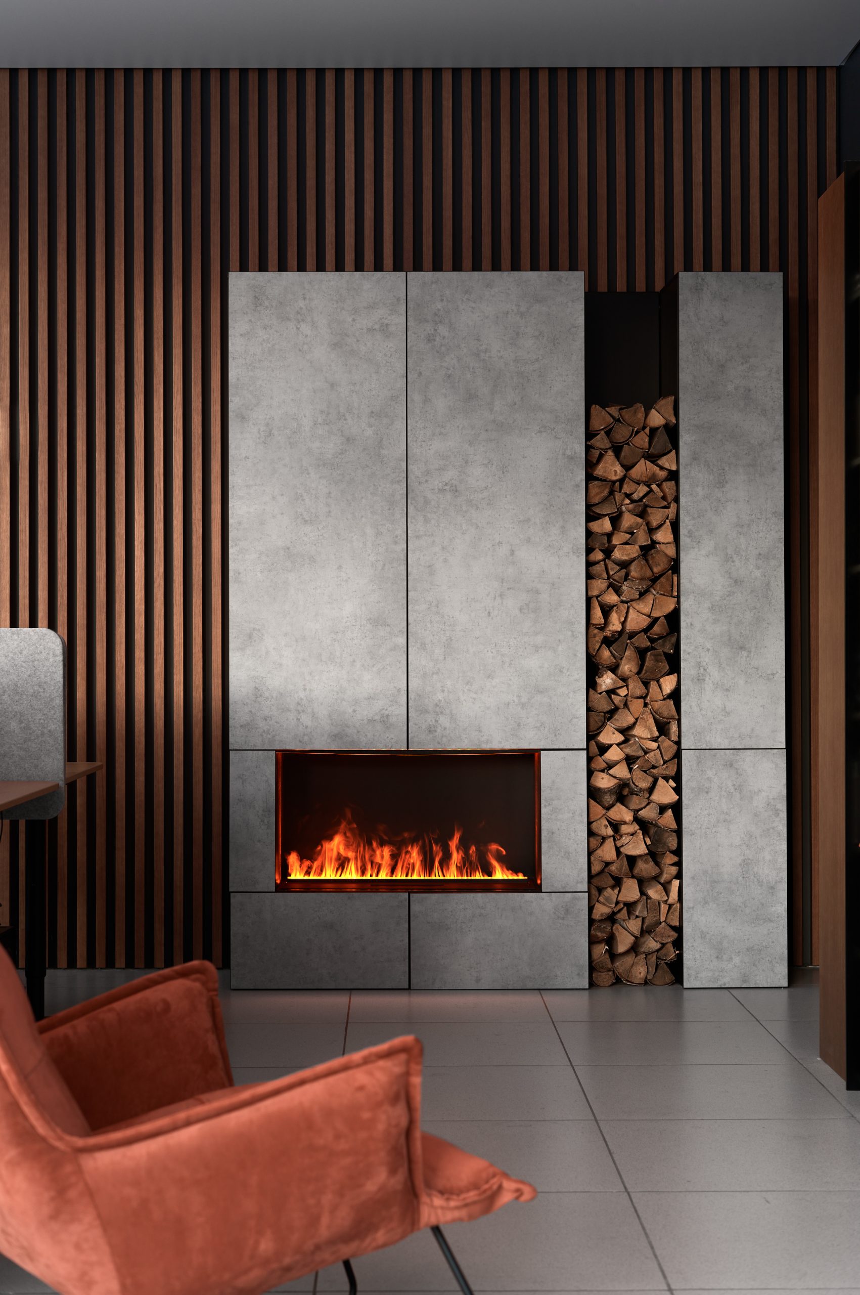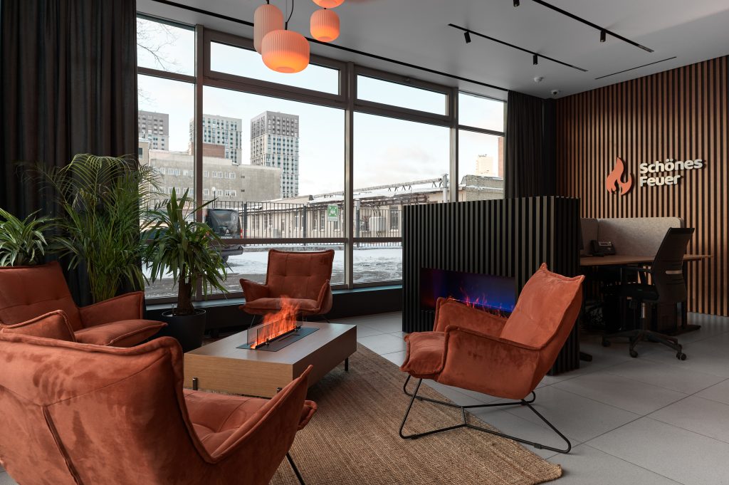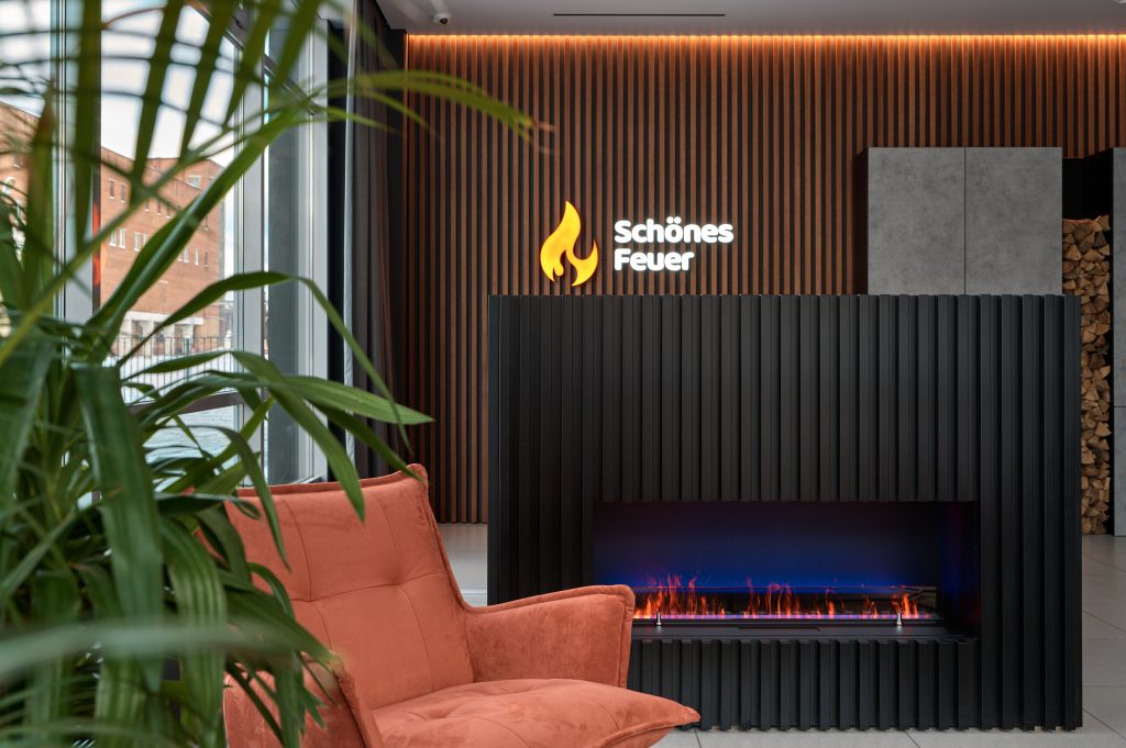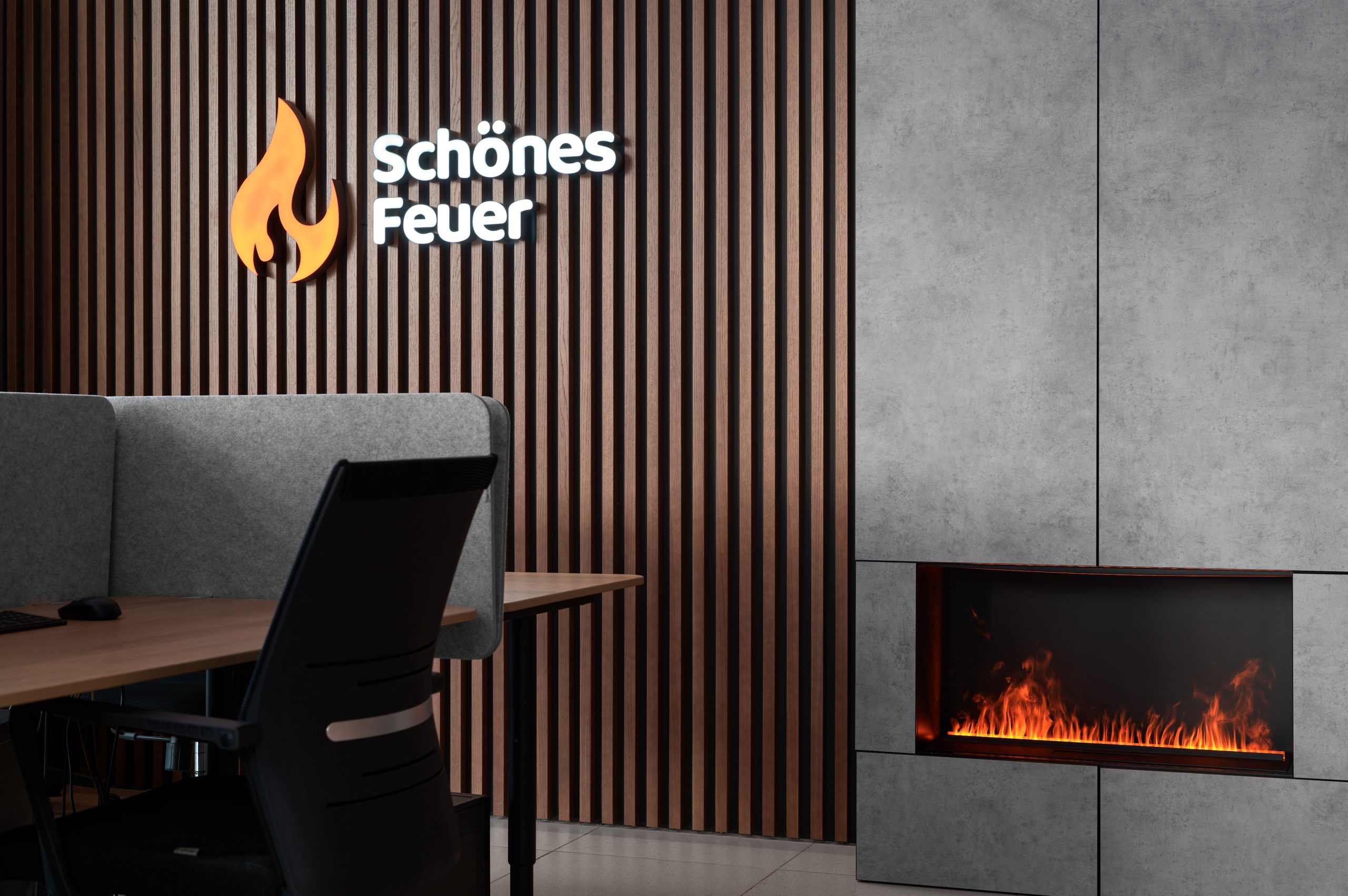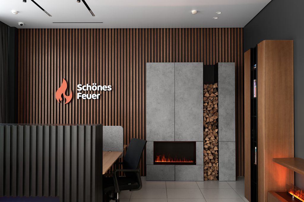 Schönes Feuer — производитель паровых каминов с собственным конструкторским отделом, производством и испытательной лабораторией. За 7 лет работы компания выросла, и шоурум не успевал за продуктом: камины в офисе стояли между рабочими столами, и пространство выглядело как склад. Для премиального продукта это недопустимо.