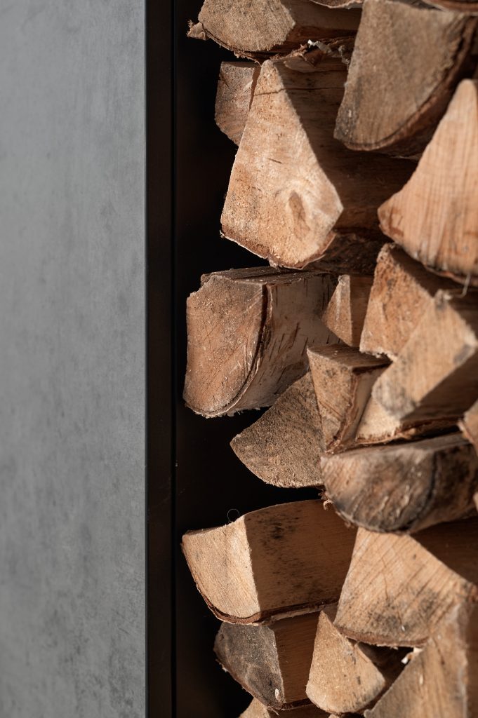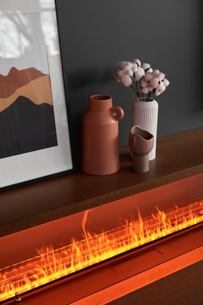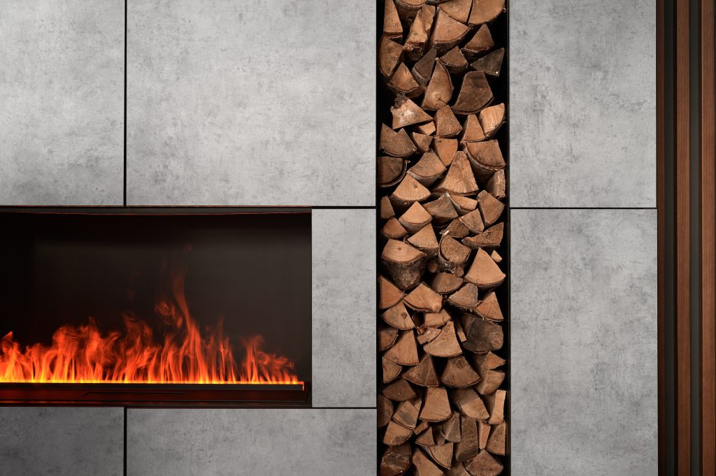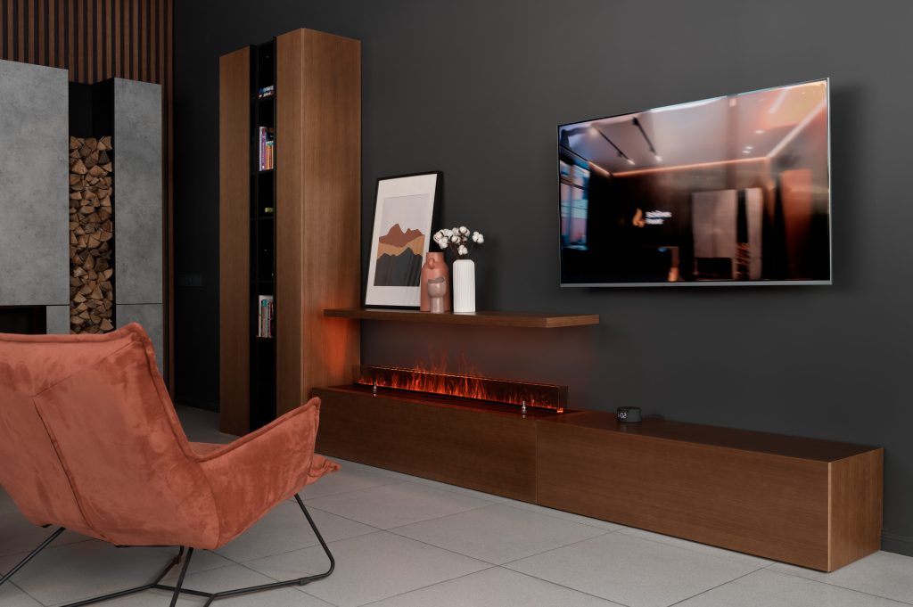 Но дизайн шоурума должен работать не только на эмоцию посетителя. Его задача — показать, как паровой камин может жить в реальном интерьере: в квартире, ресторане, гостинице. Для этого по периметру разместили разные модели каминов, каждая в своем сценарии использования. Есть камин в ТВ-нише, камин как перегородка, камин, встроенный в высокий шкаф — посетитель, сидя в кресле, может сразу увидеть все варианты.