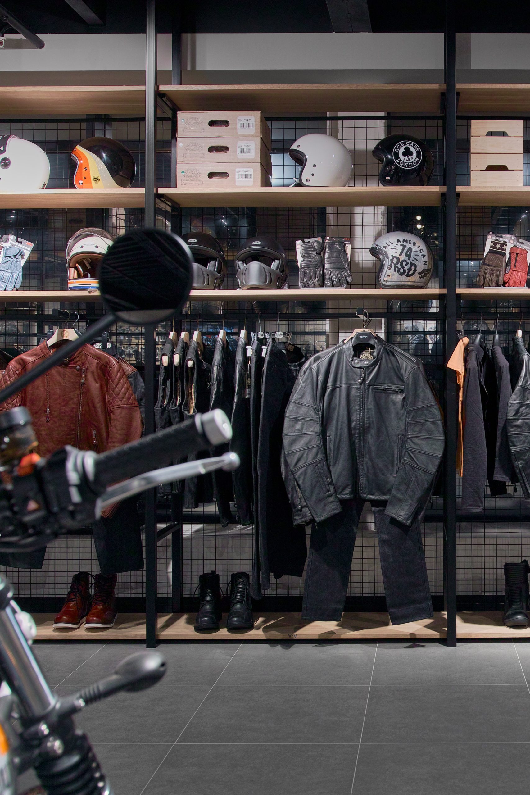 Зона одежды и экипировки специально размещена в дальней части магазина, чтобы покупатели прошли мимо мотоциклов и увидели новинки. При этом она визуально просматривается от входа — посетитель сразу ориентируется в пространстве. А еще мы собрали весь ассортимент экипировки в одном месте, это позволяет быстро оценить масштаб коллекции и найти нужное.