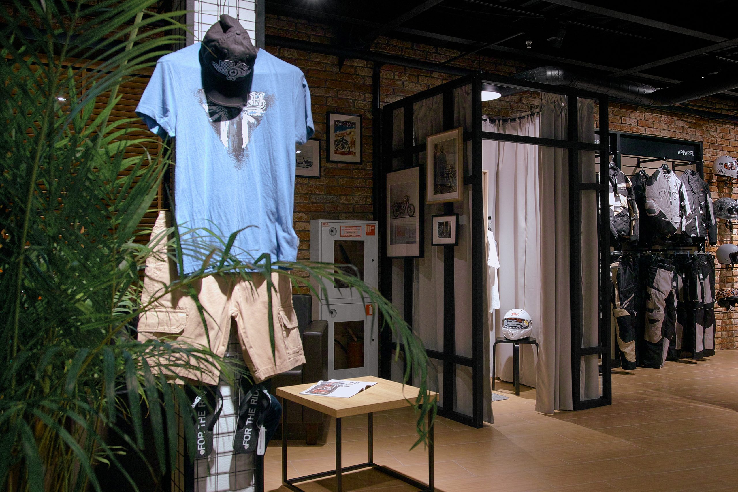 Зона одежды и экипировки специально размещена в дальней части магазина, чтобы покупатели прошли мимо мотоциклов и увидели новинки. При этом она визуально просматривается от входа — посетитель сразу ориентируется в пространстве. А еще мы собрали весь ассортимент экипировки в одном месте, это позволяет быстро оценить масштаб коллекции и найти нужное.